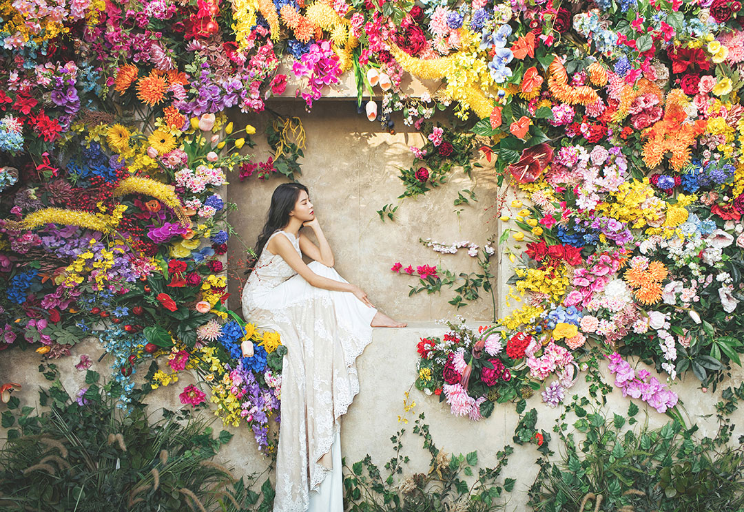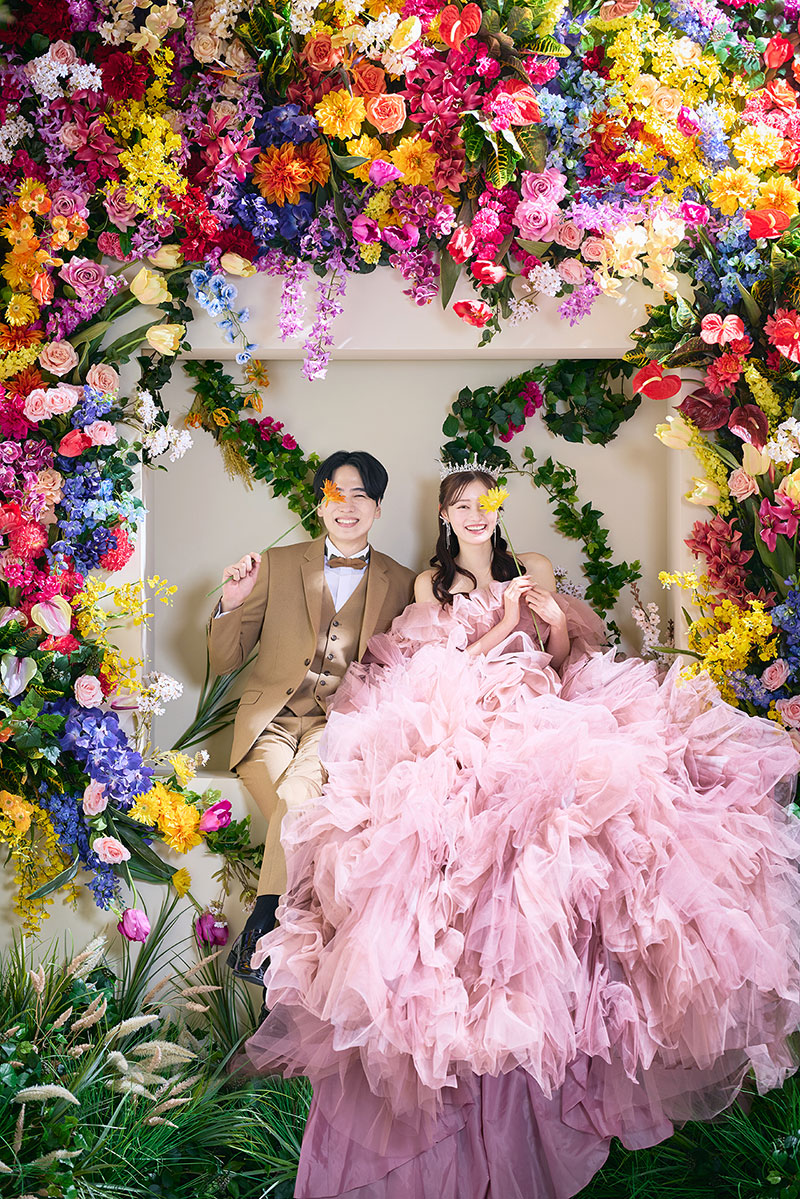 「どこで撮影しよう?」と迷ったら、 まずはこのFLOWER WALLで華やかな一枚を。