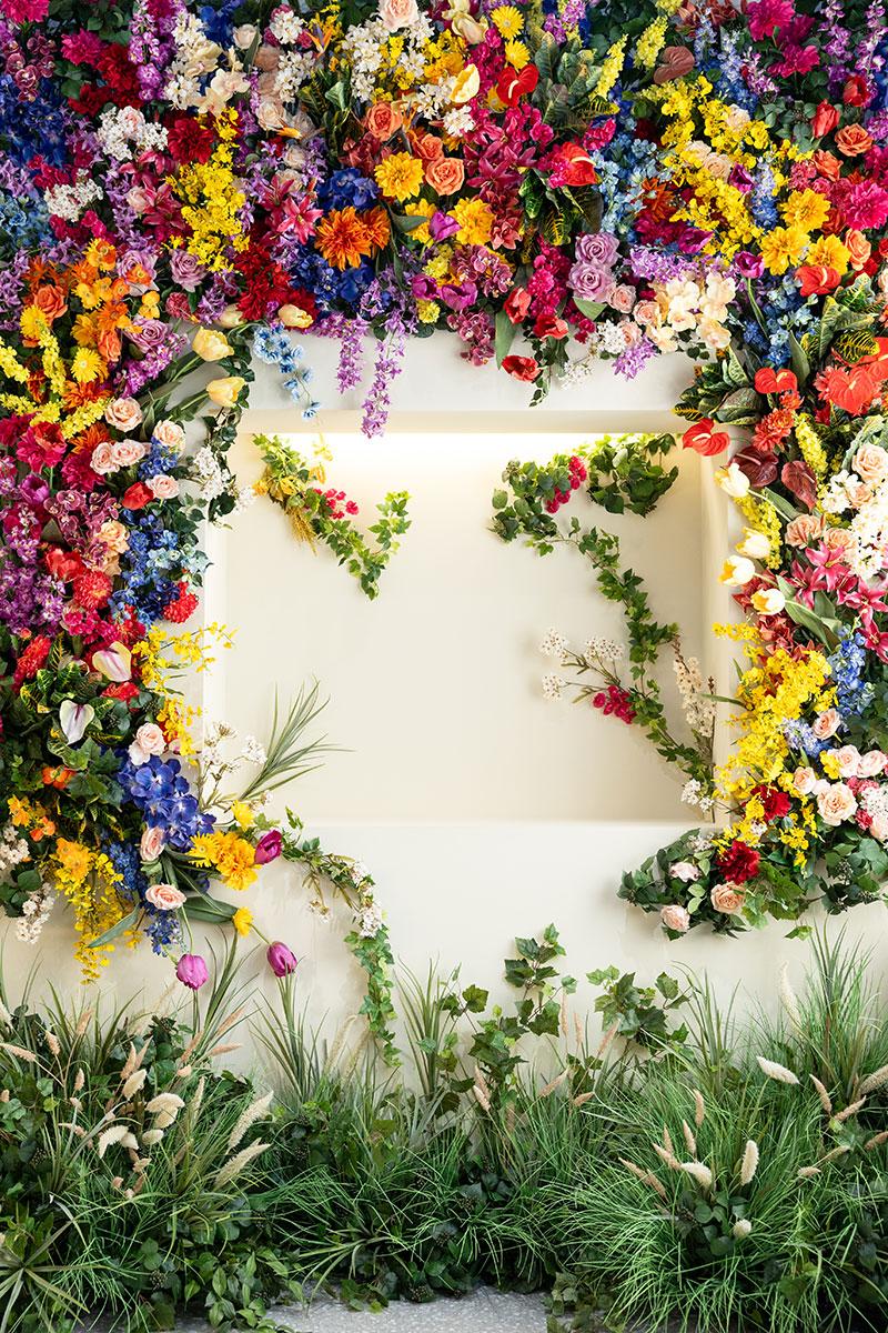 色とりどりの花々が壁一面に咲き誇り、 中央には映画のワンシーンのような窓のデザイン。ナチュラルに座って撮影したり、 エレガントなドレスと合わせて華やかに仕上げたり、 お好みのスタイルで楽しめる人気エリアです。