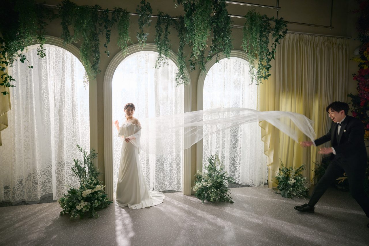スタジオにて、普段はスタッフがなびかせるベールをこの日は新郎様にもやっていただきました!